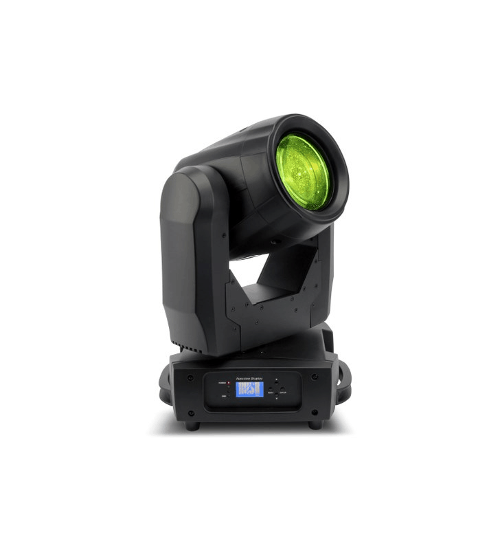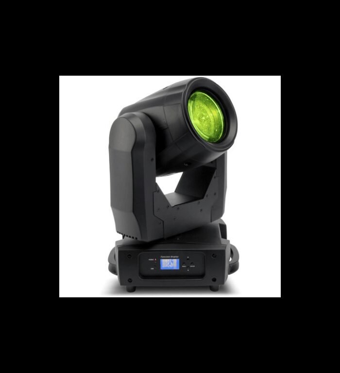LED moving head spotlight with motorized focus for dynamic lighting effects.